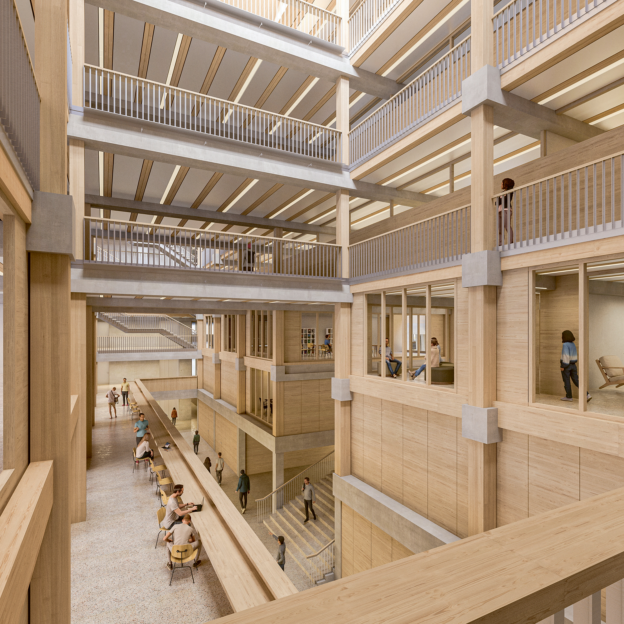 Atrium Ost des neuen Fachhochschulzentrums Graubünden. (Bild: Giuliani Hönger Architekten/Visualisierung maaars)