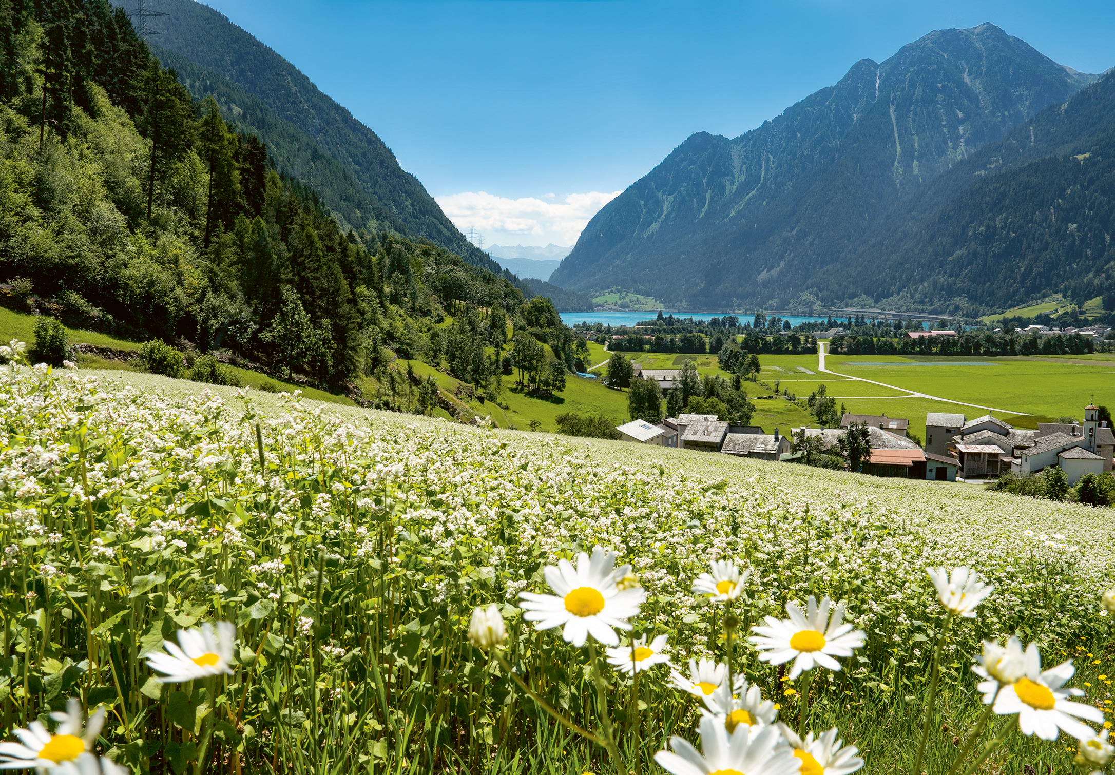 Blick auf die landwirtschaftlich genutzten Wiesen und den Lago di Poschiavo. (Bild: Valposchiavo Turismo)